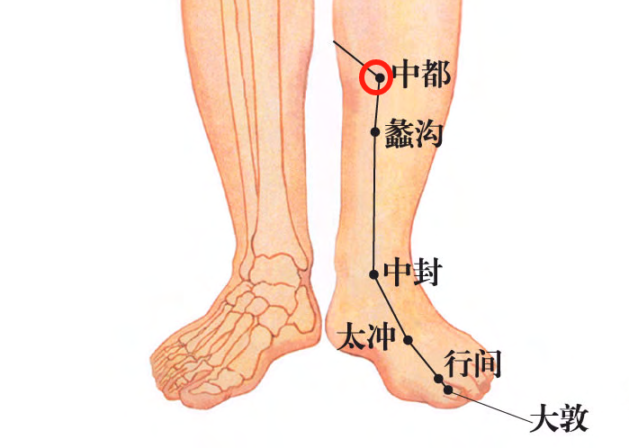 郄穴是经络血气汇聚且触感敏锐之处,它们如同脉络的“交通枢纽”,主宰着气血的顺畅循环。中都穴位于脚踝内侧尖端之上约七寸处,恰好在胫骨内侧中心的关键位置,是肝经血气流通的要害之地。